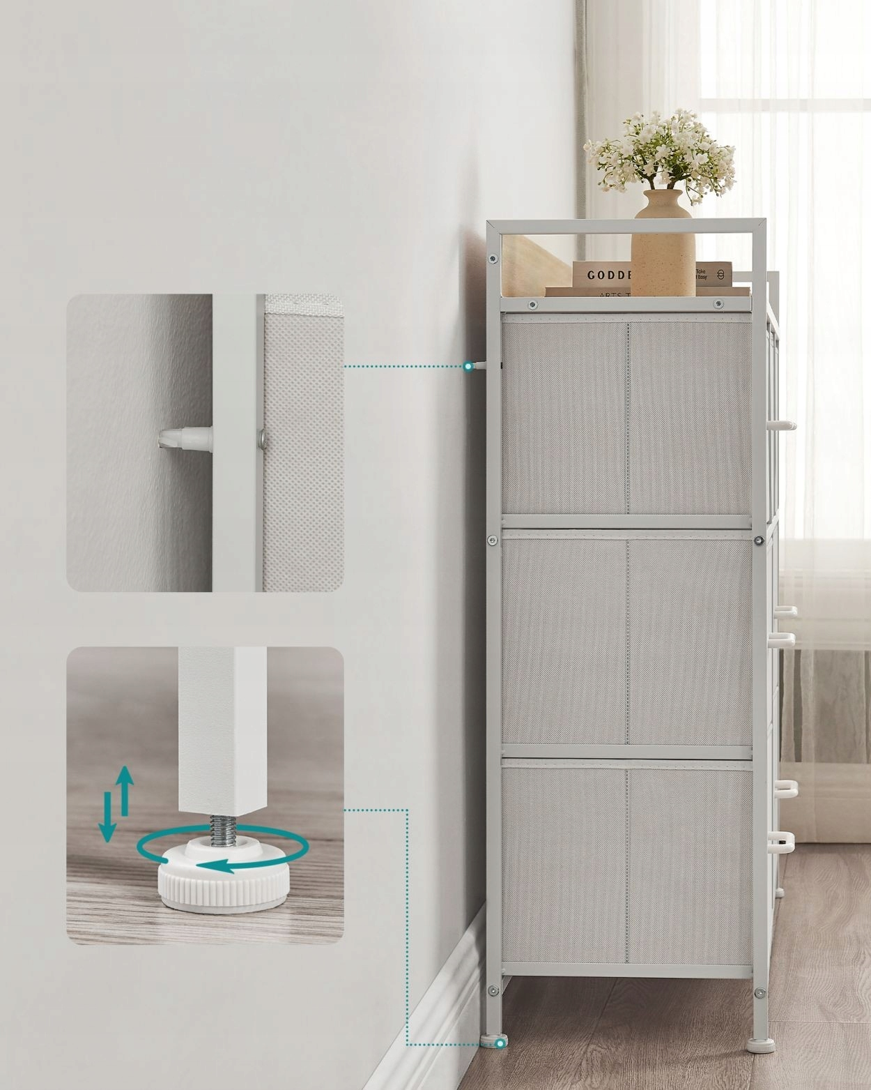 Utrzymanie komody w nienagannym stanie jest niezwykle proste – szuflady z tkaniny wystarczy przetrzeć wilgotną ściereczką. Dla pełnego bezpieczeństwa domowników, mebel został wyposażony w system zabezpieczający przed przewróceniem. Po rozpakowaniu zaleca się krótkie wietrzenie produktu, aby cieszyć się jego świeżością od pierwszych chwil.