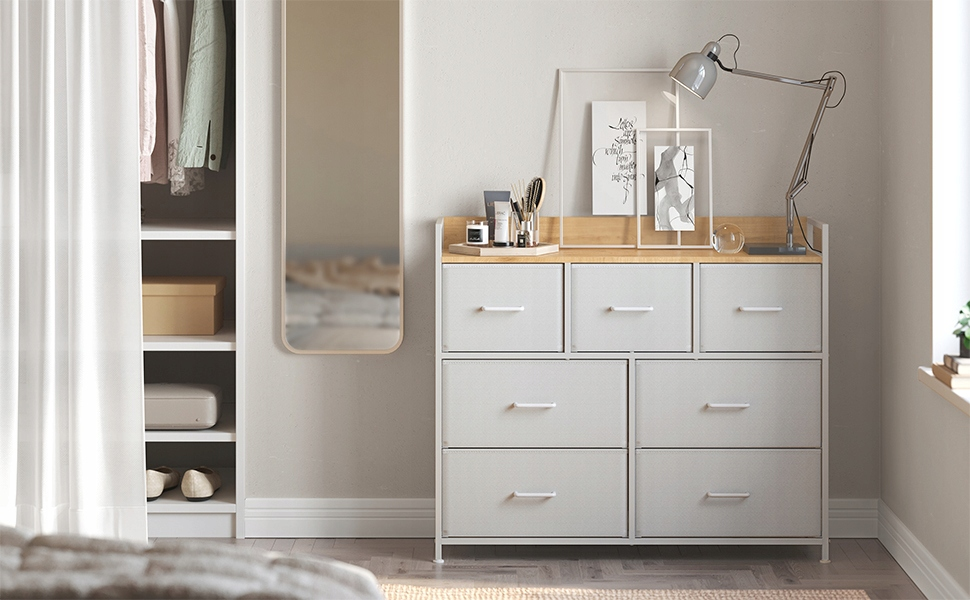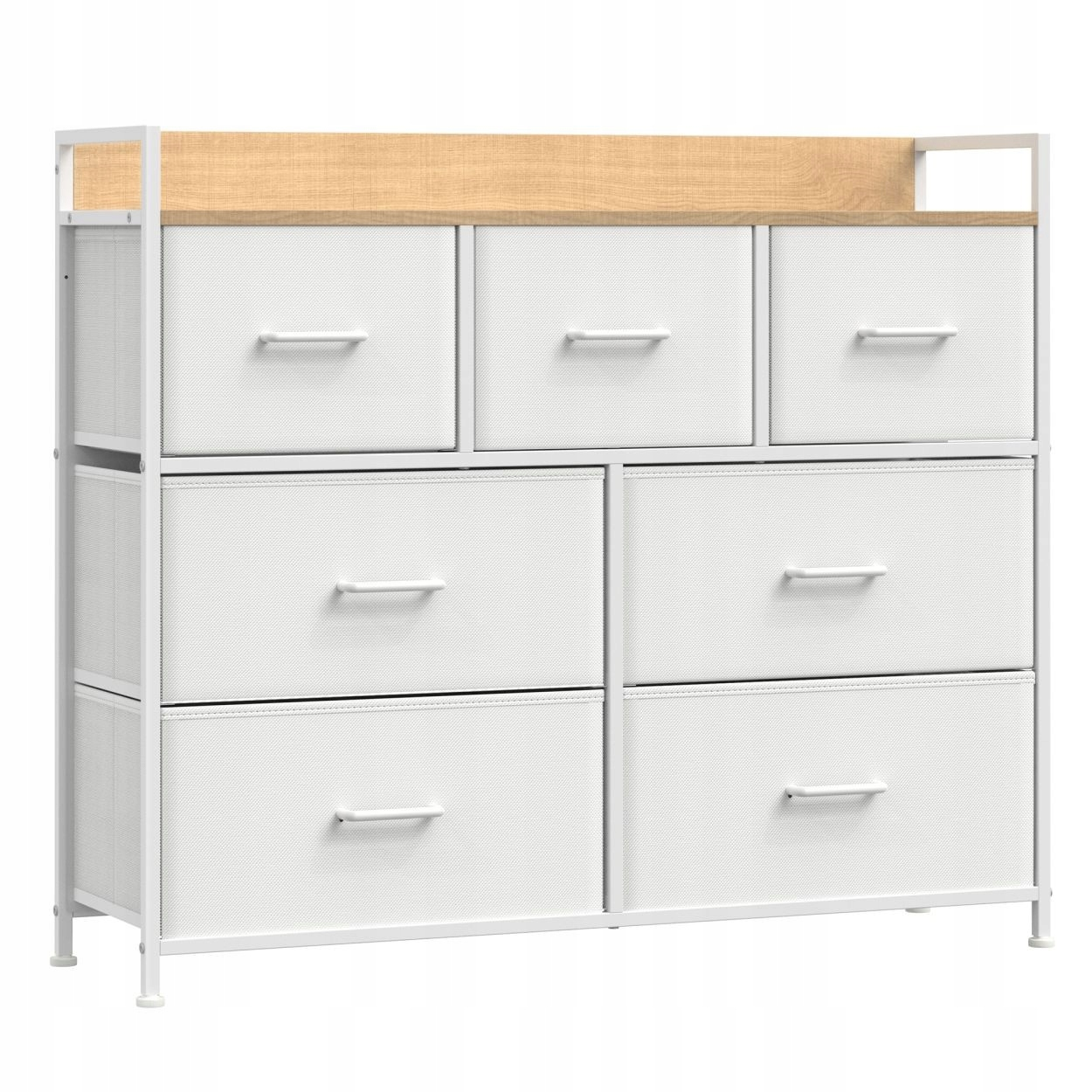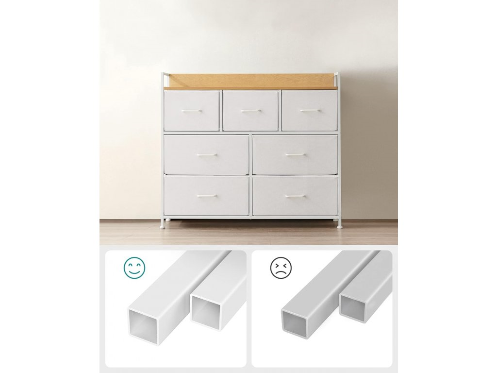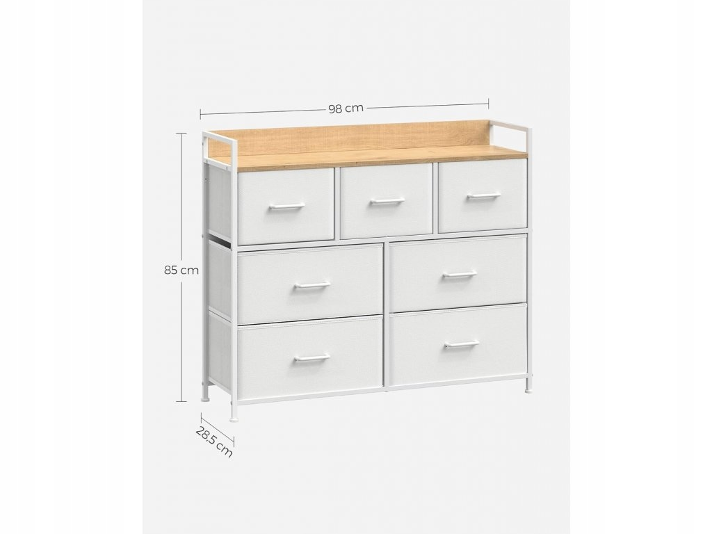 Projektując tę komodę, postawiono na detale, które robią różnicę. Siedem materiałowych szuflad (4 duże oraz 3 mniejsze) oferuje przestrzeń, która dopasuje się do Twoich potrzeb, zapewniając upragniony wypoczynek od chaosu i nieporządku. Podwyższona tylna krawędź oraz boczne listwy chronią Twoje ulubione dekoracje przed upadkiem, a metalowe uchwyty dodają całości szlachetnego charakteru. To idealne meble do salonu, sypialni czy przedpokoju, które łączą lekkość formy z ogromną wytrzymałością.
