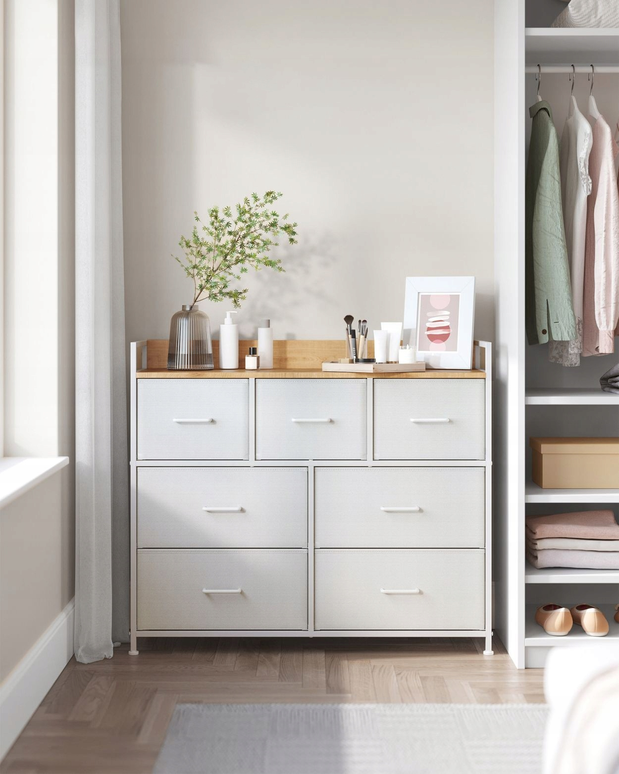 Odkryj harmonię między funkcjonalnością a estetyką dzięki komodzie marki Songmics. Ten wyjątkowy mebel to nie tylko praktyczne rozwiązanie do przechowywania, ale przede wszystkim stylowy element, który odmieni Twoje komfortowe wnętrze. Biały korpus zestawiony z blatem w kolorze naturalnego dębu tworzy luksusowy, skandynawski klimat, idealnie wpisujący się w nowoczesny design współczesnych mieszkań.