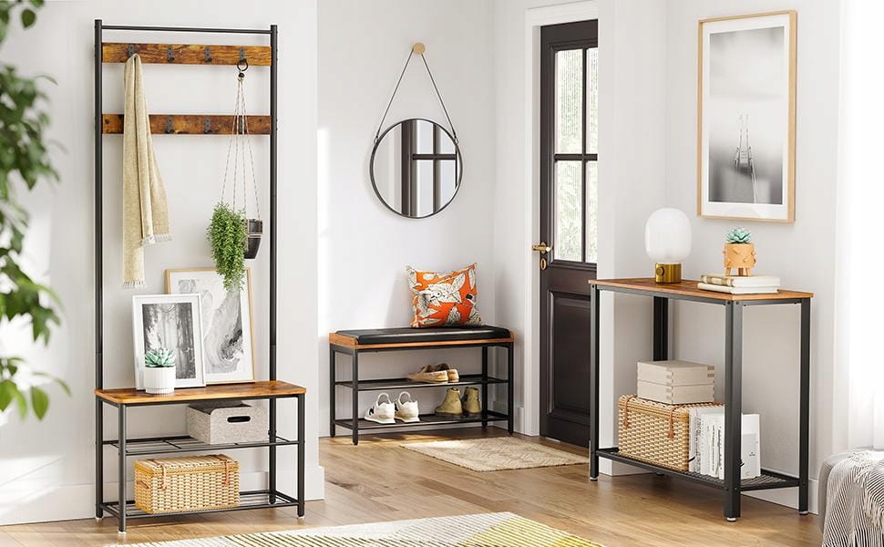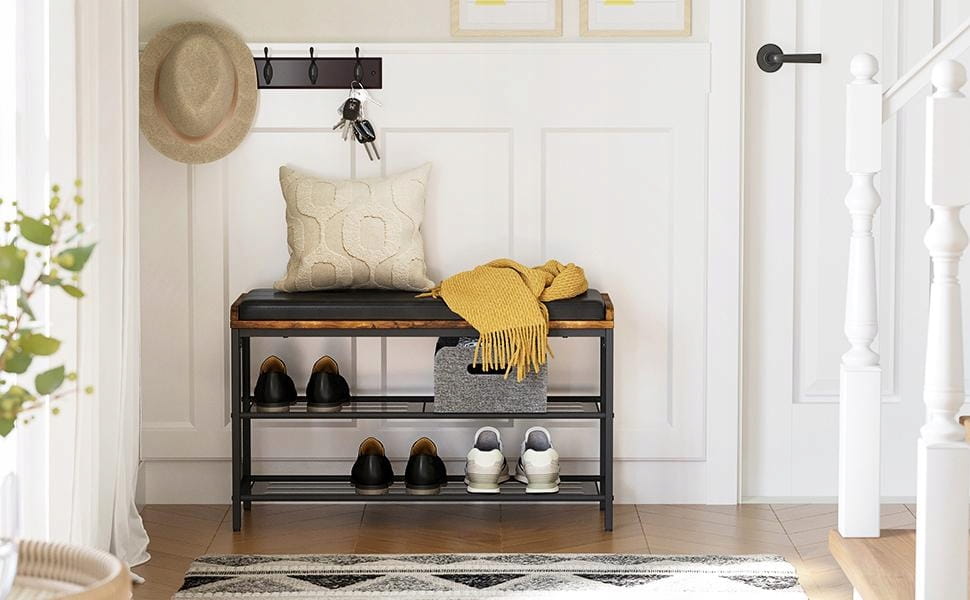 Wprowadź do swojego przedpokoju powiew luksusu i funkcjonalności z ławką marki Songmics. Ta wyjątkowa szafka na buty z siedziskiem to nie tylko praktyczny mebel, ale przede wszystkim stylowy element dekoracyjny, który definiuje nowoczesny design Twojego wnętrza. Połączenie ciepłego odcienia vintage z surową, czarną stalą sprawia, że produkt idealnie wpisuje się w estetykę loftową i industrialną, tworząc komfortowe wnętrze już od samego progu.