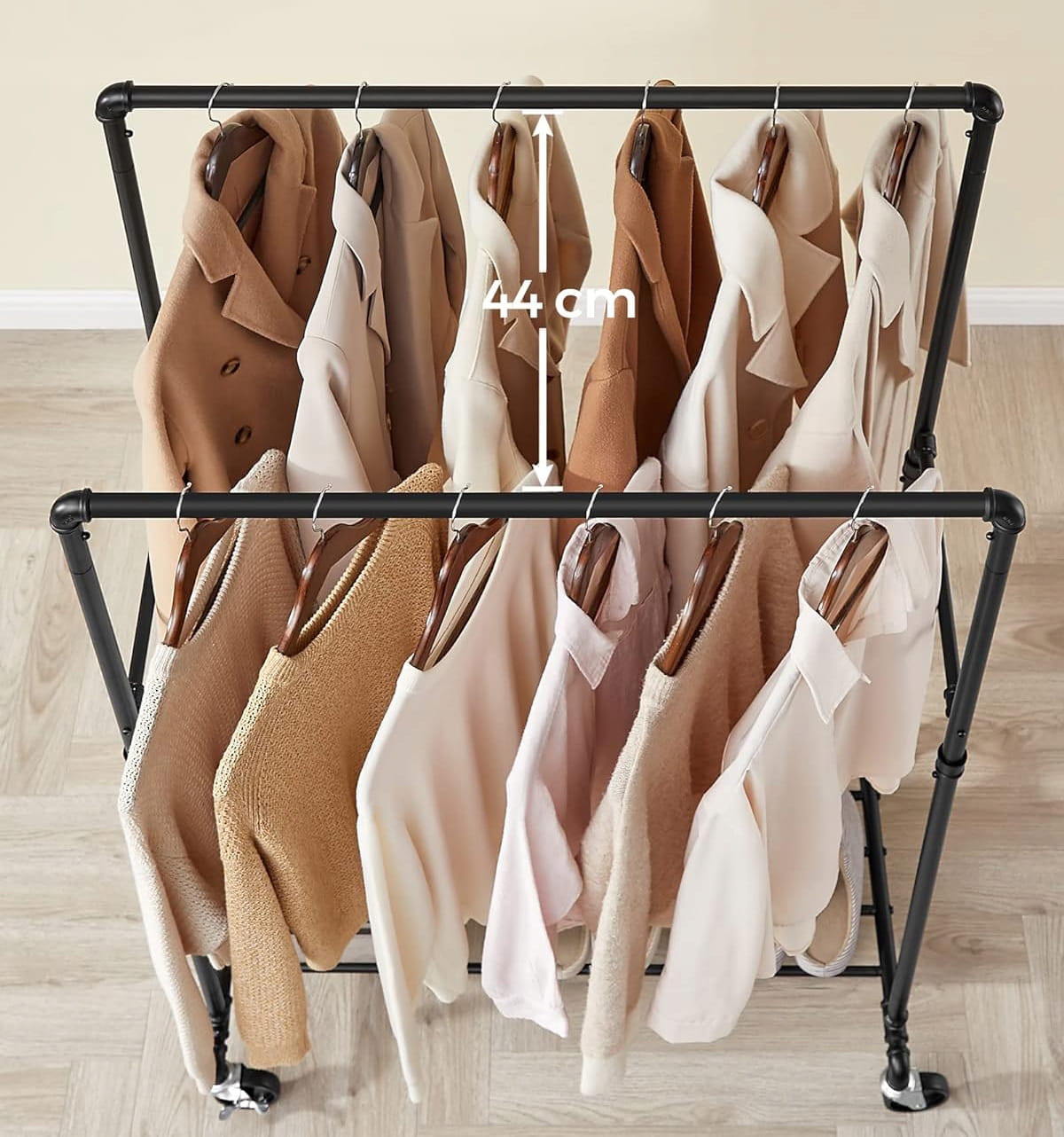 Projektując ten wieszak, postawiono na nowoczesny design połączony z maksymalną funkcjonalnością. Odstęp 44 cm między drążkami zapewnia swobodną cyrkulację powietrza, co sprawia, że Twoje ubrania pozostają świeże, a proces ich suszenia po praniu jest znacznie szybszy. Mobilność zapewniona przez cztery zwrotne kółka sprawia, że Twój domowy wypoczynek nie musi być zakłócony bałaganem – w każdej chwili możesz przesunąć całą garderobę w inne miejsce.