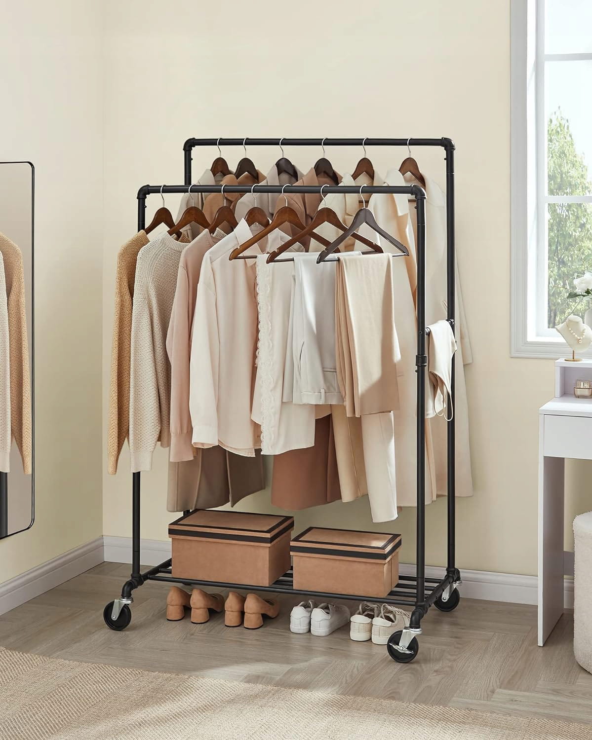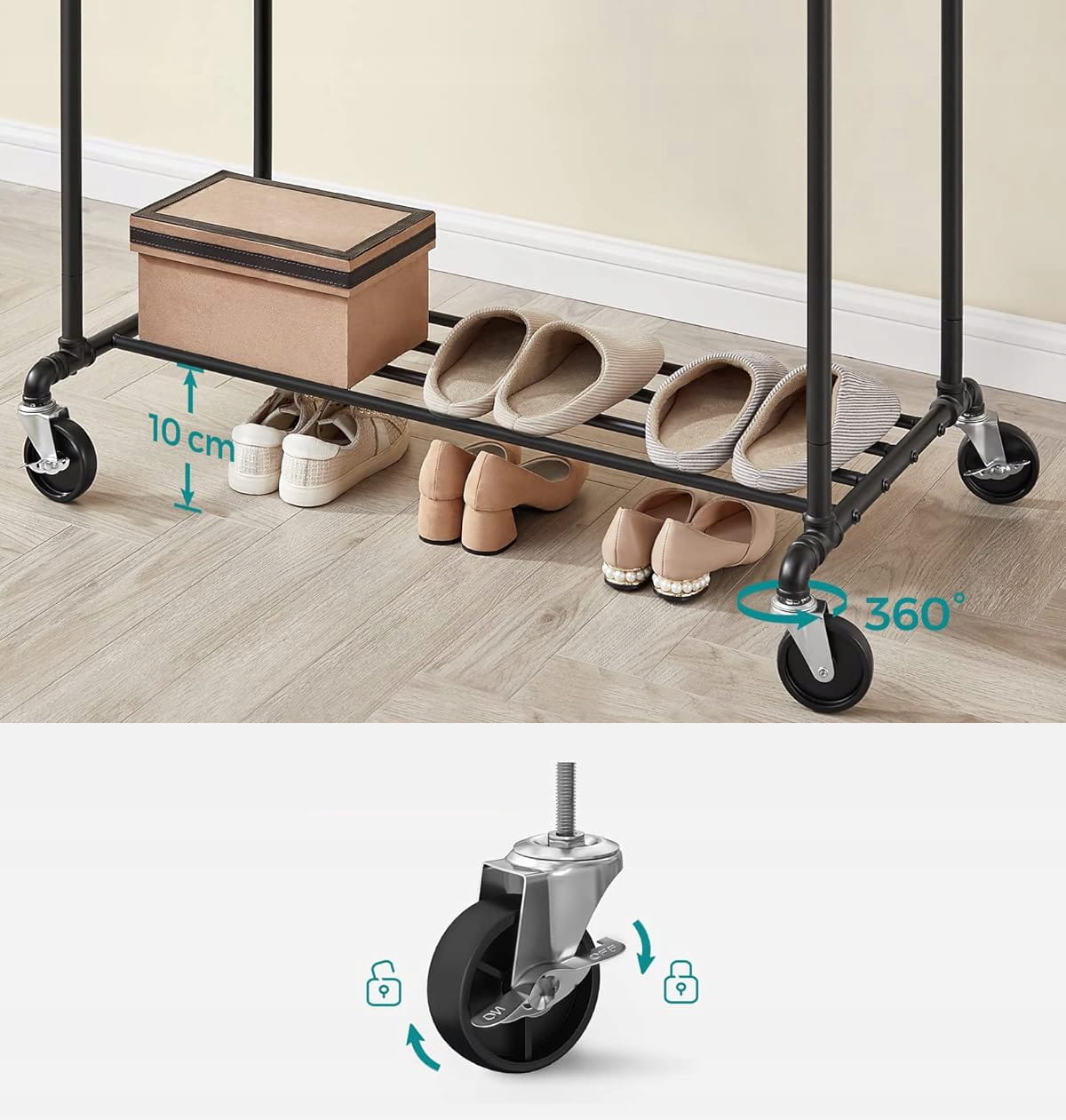- Mobilność i swoboda – cztery solidne kółka umożliwiają płynne przemieszczanie wieszaka między sypialnią a garderobą.