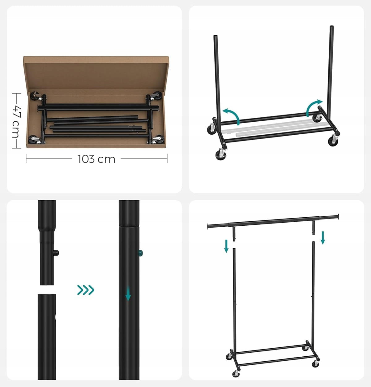 - Pełna mobilność – cztery obrotowe kółka 360° umożliwiają swobodne przemieszczanie wieszaka, a dwa hamulce gwarantują stabilność.