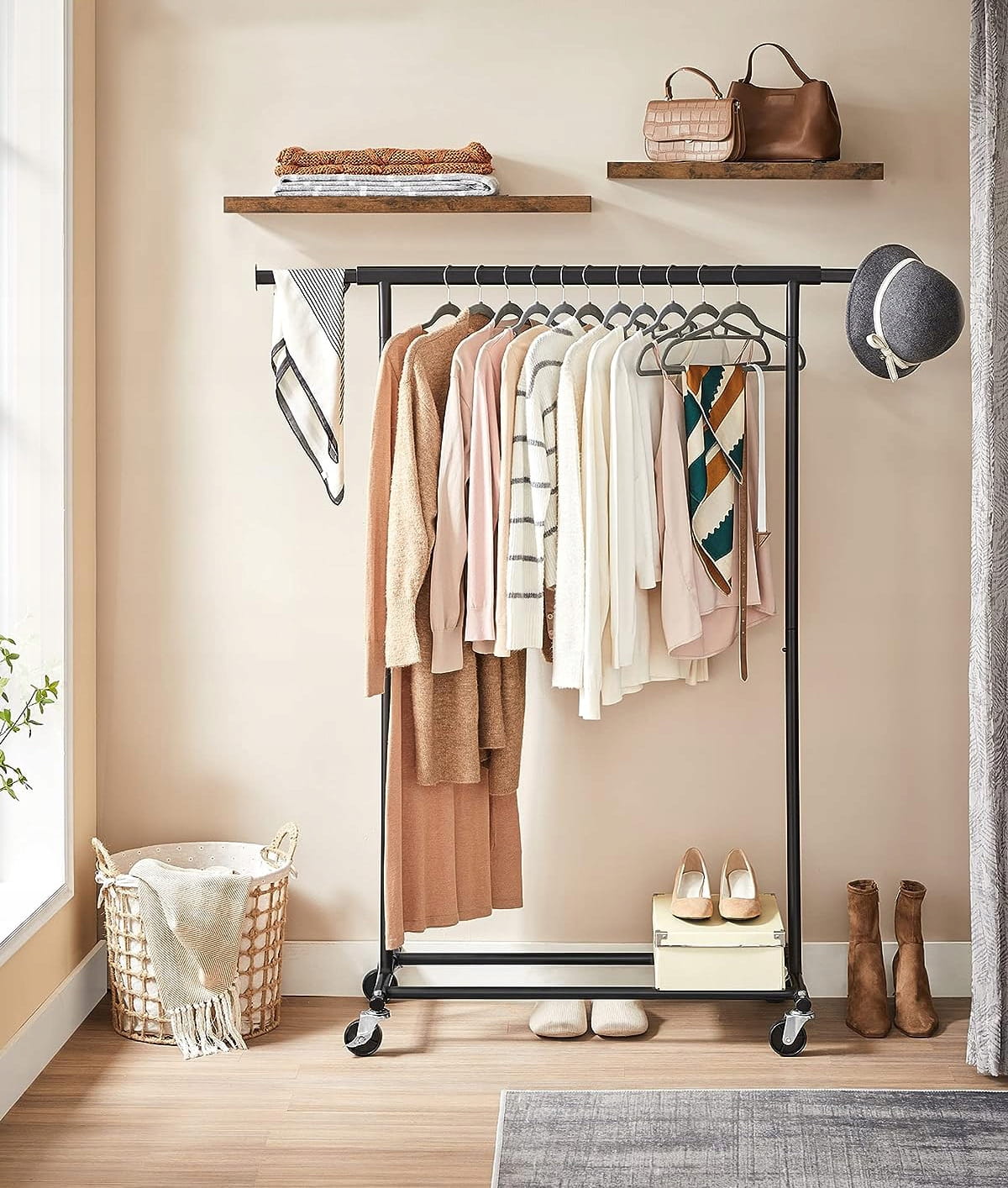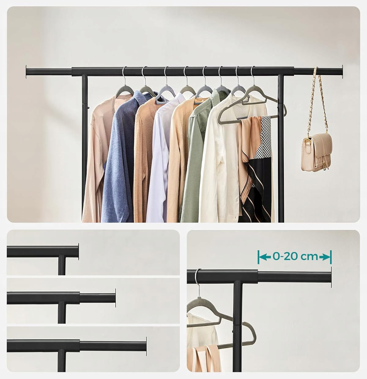 Projektując ten model, postawiono na maksymalną użyteczność. Regulowany drążek pozwala na elastyczne zarządzanie przestrzenią – możesz go wydłużyć o dodatkowe 40 cm, zyskując miejsce na torebki, szaliki czy kapelusze. Dolne drążki to idealna przestrzeń na pudełka z obuwiem lub kosze z drobiazgami, co czyni go kompletnym systemem do przechowywania. Wypoczynek w uporządkowanym salonie czy sypialni staje się znacznie przyjemniejszy, gdy każda rzecz ma swoje miejsce.