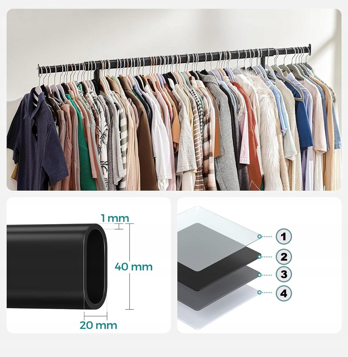 - Wyjątkowa wytrzymałość – solidna stalowa konstrukcja o udźwigu do 90 kg pozwala na bezpieczne przechowywanie nawet ciężkich płaszczy.