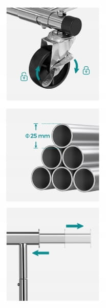 Wyjątkowa estetyka chromowanych rur sprawia, że wieszak prezentuje się doskonale zarówno w garderobie, jak i jako eksponowany element w sypialni czy przedpokoju. Dzięki regulowanemu drążkowi, który możesz wysunąć o dodatkowe 40 cm, zyskujesz przestrzeń na luksusowe płaszcze, torebki czy kapelusze. To idealny wypoczynek dla Twojej garderoby – ubrania wiszą swobodnie, nie gniotą się i są zawsze pod ręką. Ciche, polipropylenowe kółka pozwalają na bezszelestne przesuwanie mebla, nawet przy pełnym obciążeniu.