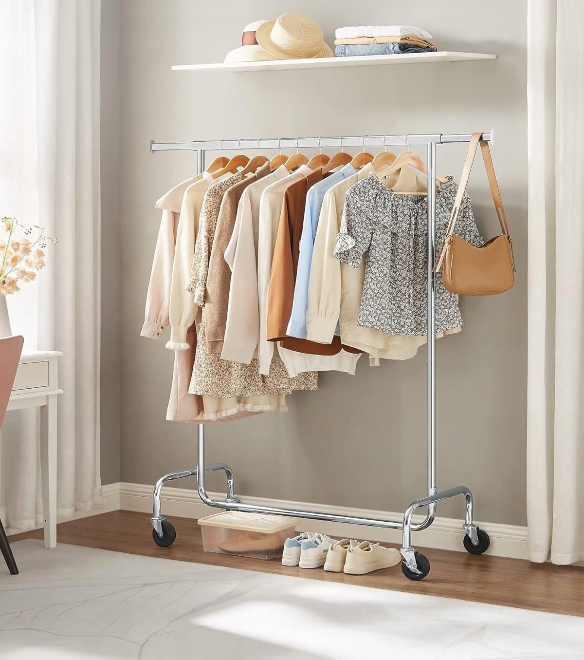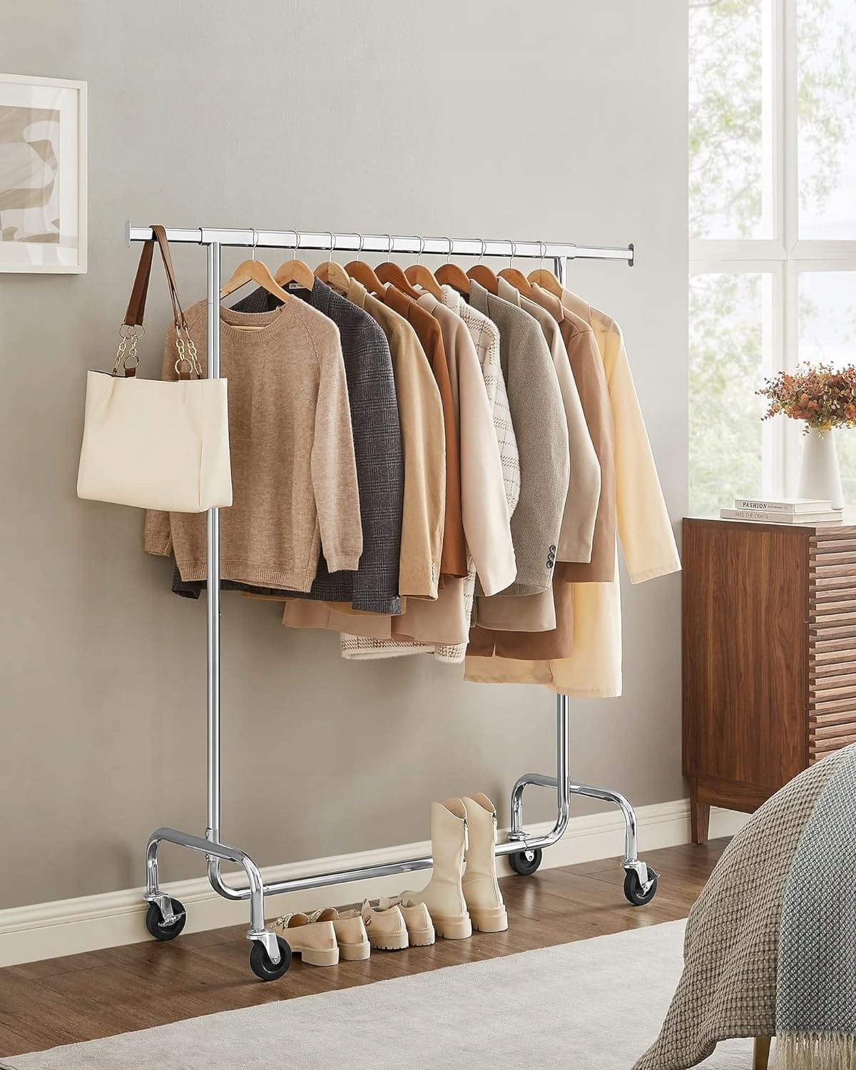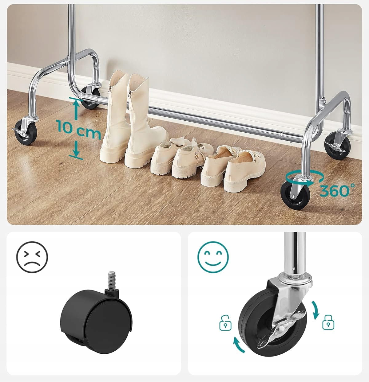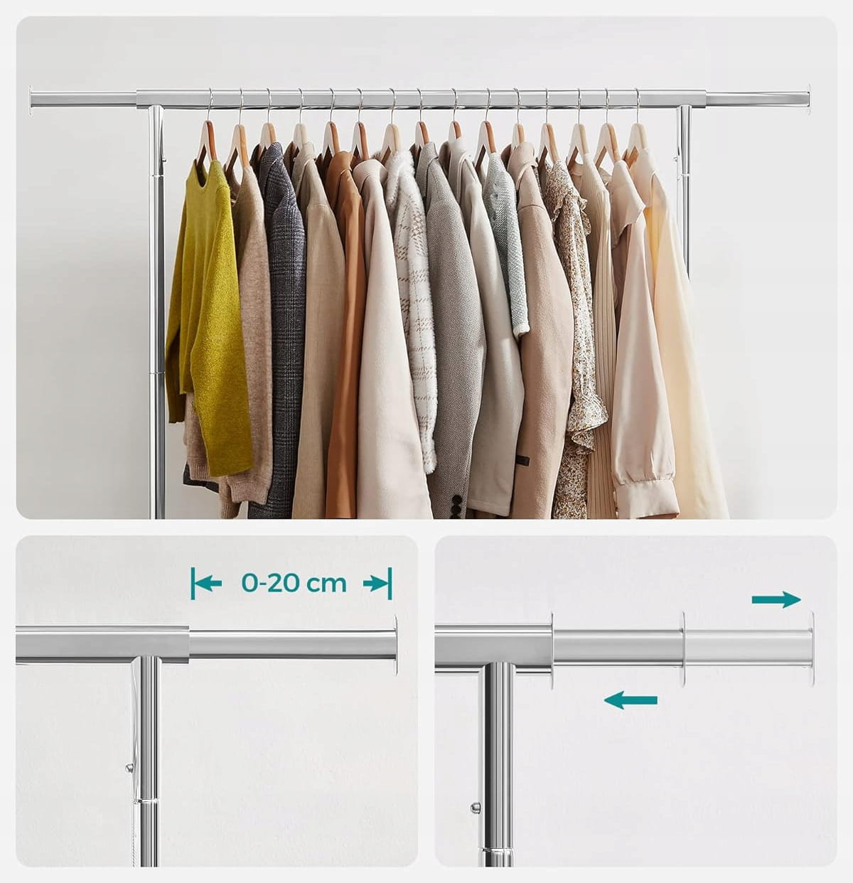 Projektując ten model, postawiono na komfortowe wnętrze i elastyczność użytkowania. Drążek główny posiada funkcję rozsuwania (od 110 do 150 cm), co daje dodatkowe 40 cm przestrzeni na Twoje ubrania. Specjalnie zaprojektowane końcówki drążka służą jako idealne miejsce na torebki, szale czy kapelusze. Całość osadzona jest na czterech skrętnych kółkach, co pozwala na swobodną zmianę aranżacji pomieszczenia bez żadnego wysiłku.