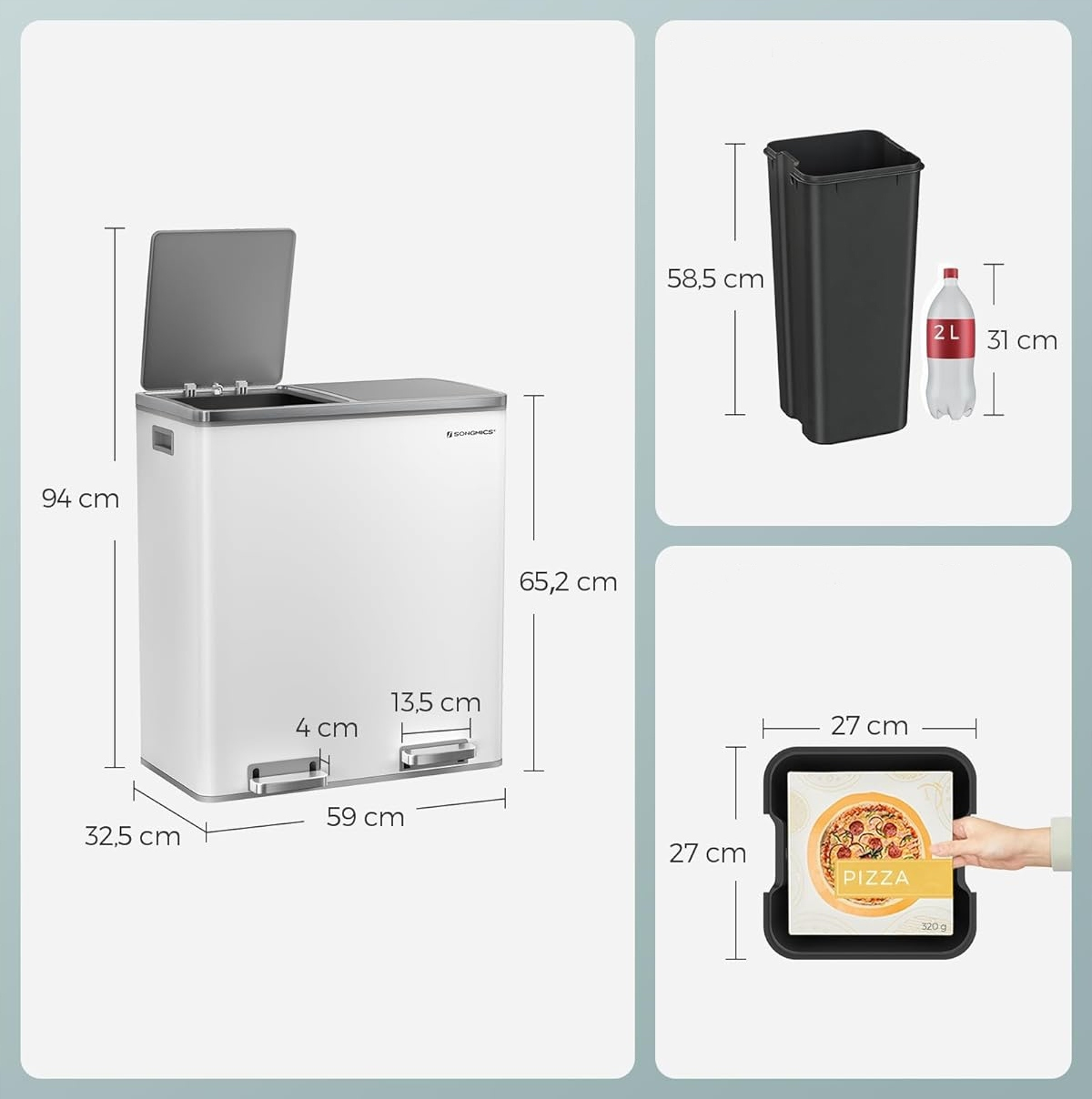 - Wymiary kubełka wewnętrznego: 27,0 x 27,0 x 58,5 cm