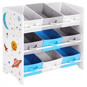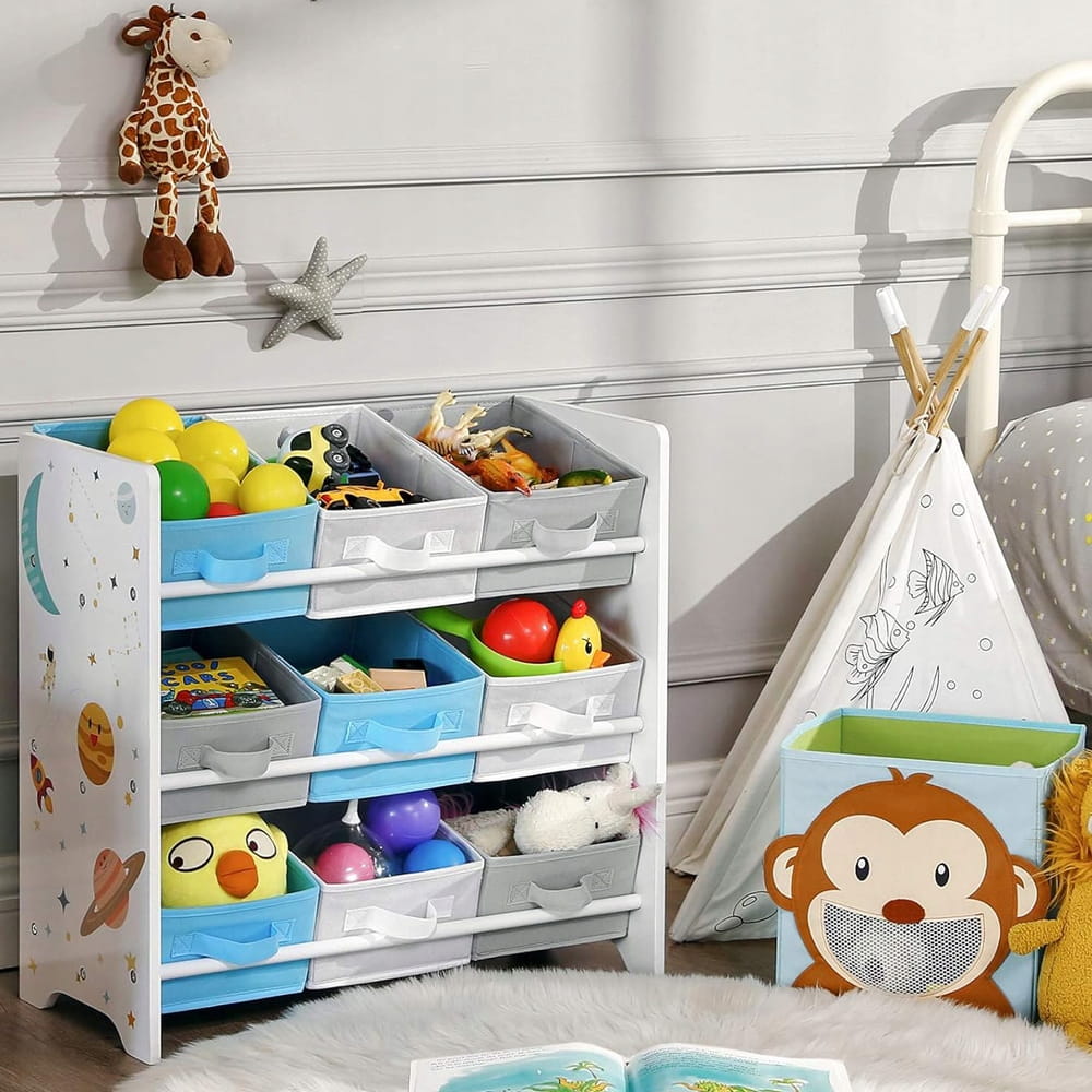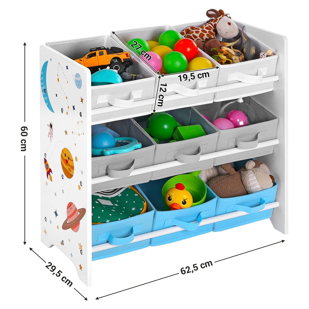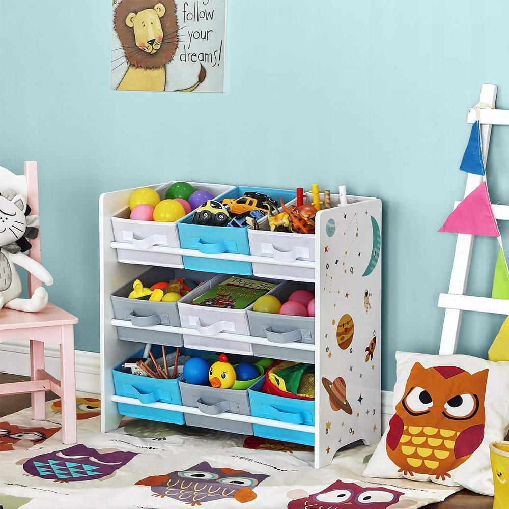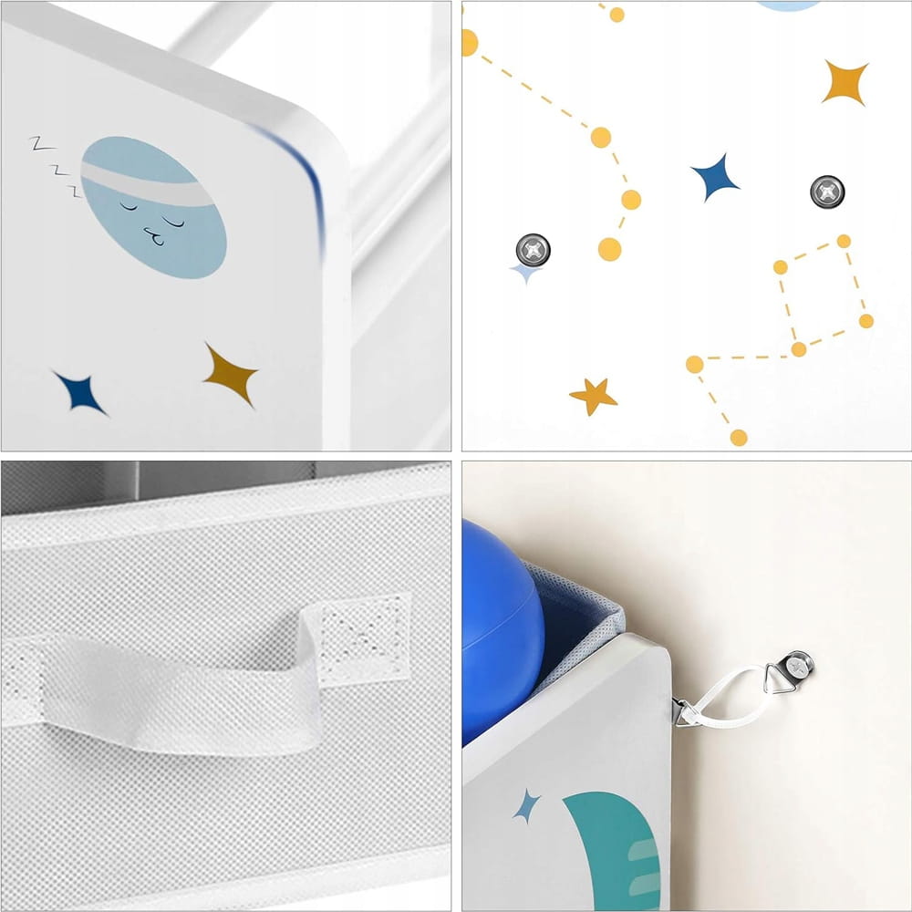 Nowoczesny design regału opiera się na unikalnym motywie planet i gwiazd, który pobudza wyobraźnię. Wyposażony w 9 kolorowych, wyjmowanych pudełek z włókniny, pozwala na dowolną aranżację – pojemniki można ustawić prosto lub pod kątem, co ułatwia dostęp do ulubionych klocków czy książek. To idealny wypoczynek dla rodziców od codziennego bałaganu, wiedząc, że każda zabawka ma swoje miejsce.