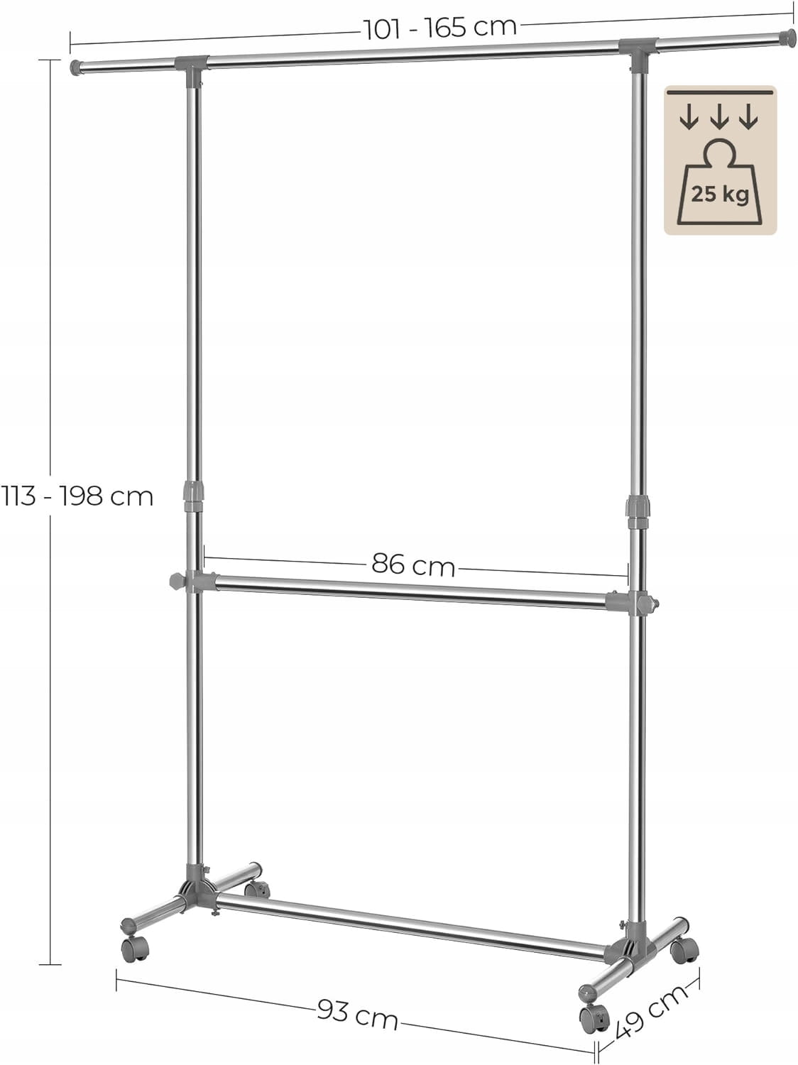 - Maksymalne obciążenie: Do 25 kg na drążek (ok. 20 sztuk odzieży).